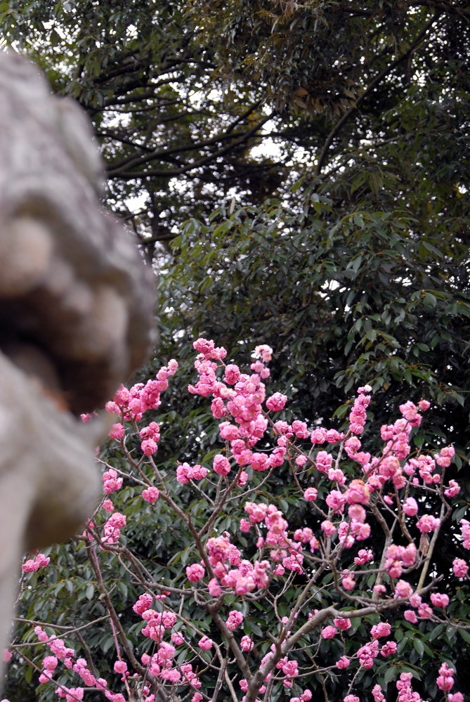 紅梅です。狛犬をアクセントに。