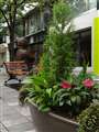 手前の植木鉢にピントを合わせて、絞りを変えて何枚か撮ってみればいいと思います。