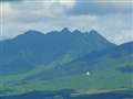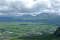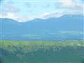 写真1)阿蘇くじゅう国立公園内、阿蘇北外輪山の兜岩展望台から北、リムの向こうにくじゅう連山を見ています。ほぼ中央に沓掛山、その左、鞍部は牧ノ戸峠、山裾右寄りの赤い屋根の建物は瀬の本高原三愛レストハウス。