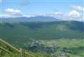 写真3)根子岳と、高岳山腹の仙酔峡。白い建物はロープウェイ発着所。