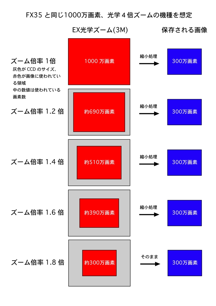デジタルズームとEX光学ズームで使われているCCD領域の比較