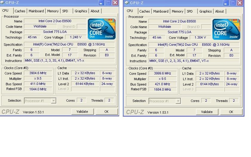 『デフォルト電圧と昇圧での差』インテル Core 2 Duo E8500 BOX オリエントブルーさんのクチコミ掲示板画像1/1