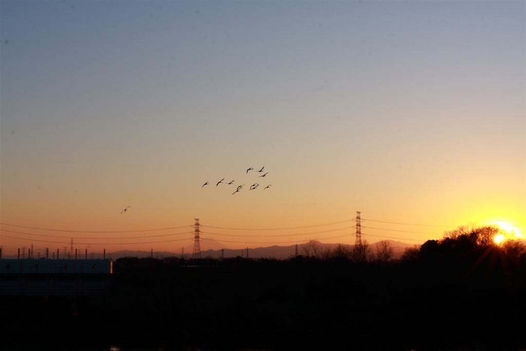富士山と夕陽をバックに