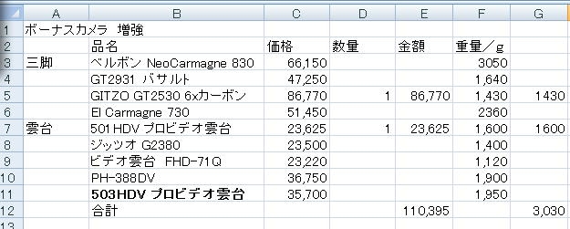 三脚・雲台 エクセルで比較検討中