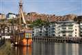 横浜の帆船は、周りを高層ビルで囲まれていて