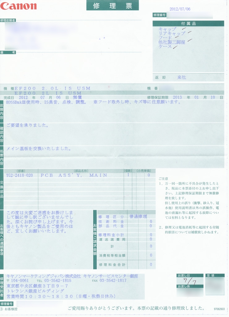 『IS異音の不具合修理票控』CANON EF200mm F2L IS USM Digic信者になりそう_χさんのクチコミ掲示板画像1/1