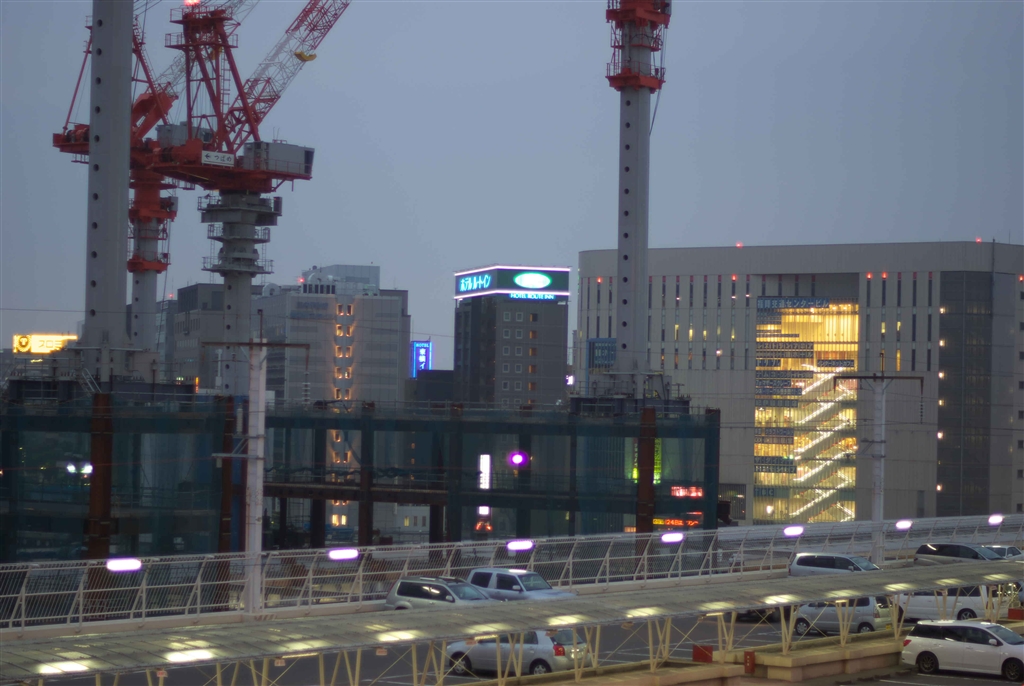 19時30分頃の博多駅の屋上駐車場。露出は約2.3オーバーで、明るく取りすぎ。