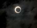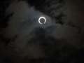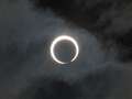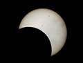 21日の予報は関東地方は曇りか雨、とは残念。当日に備えて、11日に撮影練習しました。丁度、お昼前だったので、太陽はほぼ真上にあり、三脚を付けての撮影が大変だった。12倍ズームにデジタルズームが4倍で計48倍、画面はすぐぐらぐらするし、首は痛い。おまけに光量減少フィルター3枚(光量を計5万分の1に減少)を付けて、被写体(太陽)探しにひと苦労した。マニュアルには「距離、絞りともマニュアルで」と書いてあるが、普段は絞りオートでの撮影が多いので、手動の撮影は難しかった。やむなくプログラムオートや絞り優先で何枚か撮影した。そのうちの1枚がこの写真。機材はパナソニック製LumixFZ50で、撮影データは絞りF8、1/1000秒、露出補正−1、プログラムオート、中央部重点測光、露出補正51200倍(400×16×8倍)。ほぼ中央に大きな黒点が見えて一人納得しました。