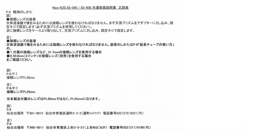 『正誤表』ケンコー NEW KDS 63-800 オーロラのきらめきさんのクチコミ掲示板画像1/1