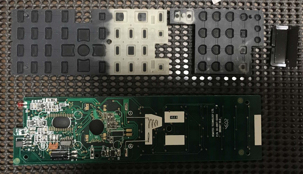 上;キー(ゴム)パッド、と右端 リモコン窓、下;基板 電池側電極有