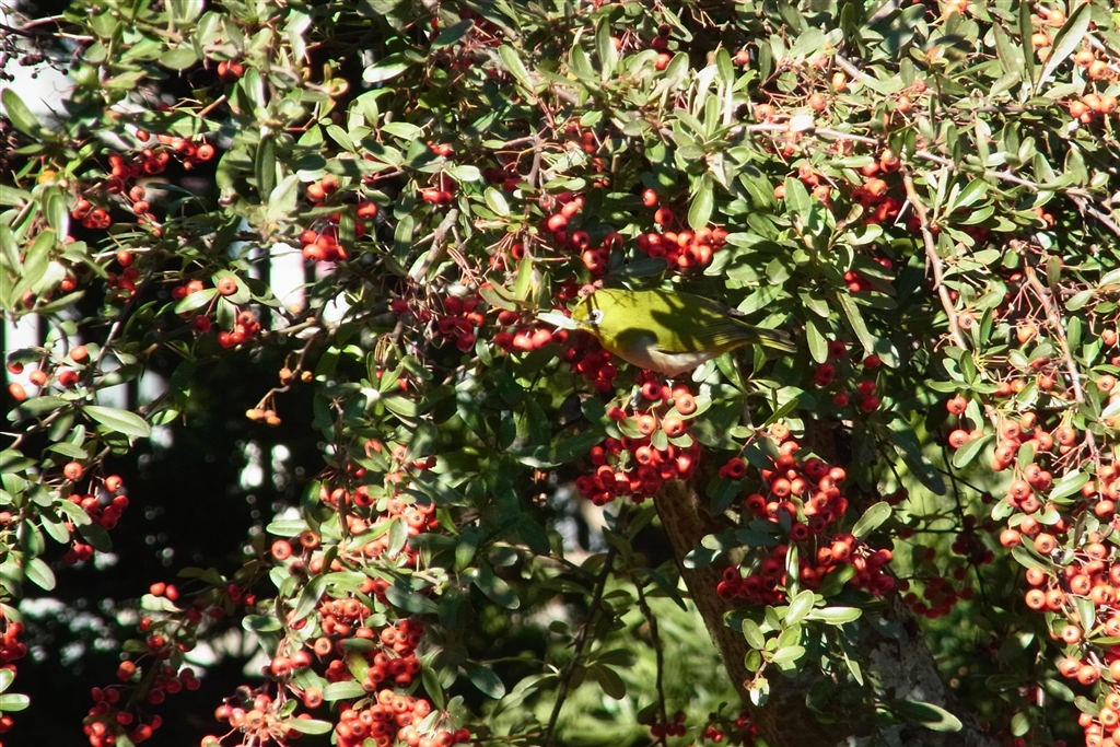 ピラカンサにメジロ