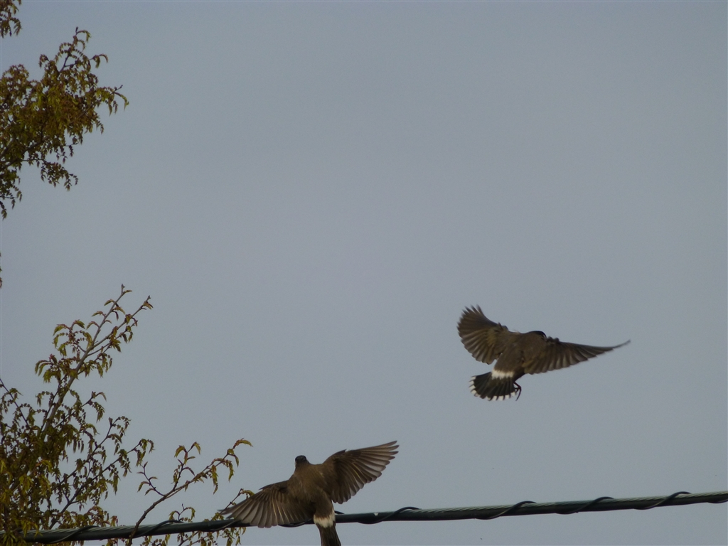 電線に止まろうとする2羽のムクドリさん