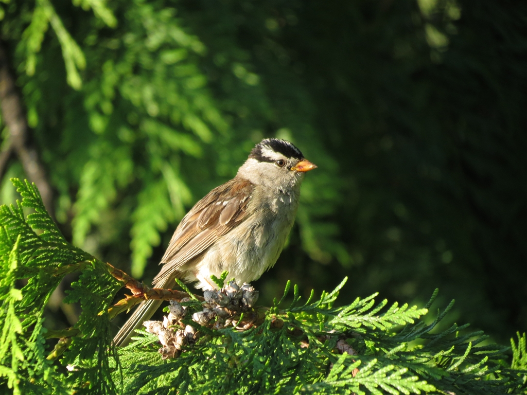 背景が暗く、鳥に直射日光。少しマイナス補正。でもまだ白トビしている。