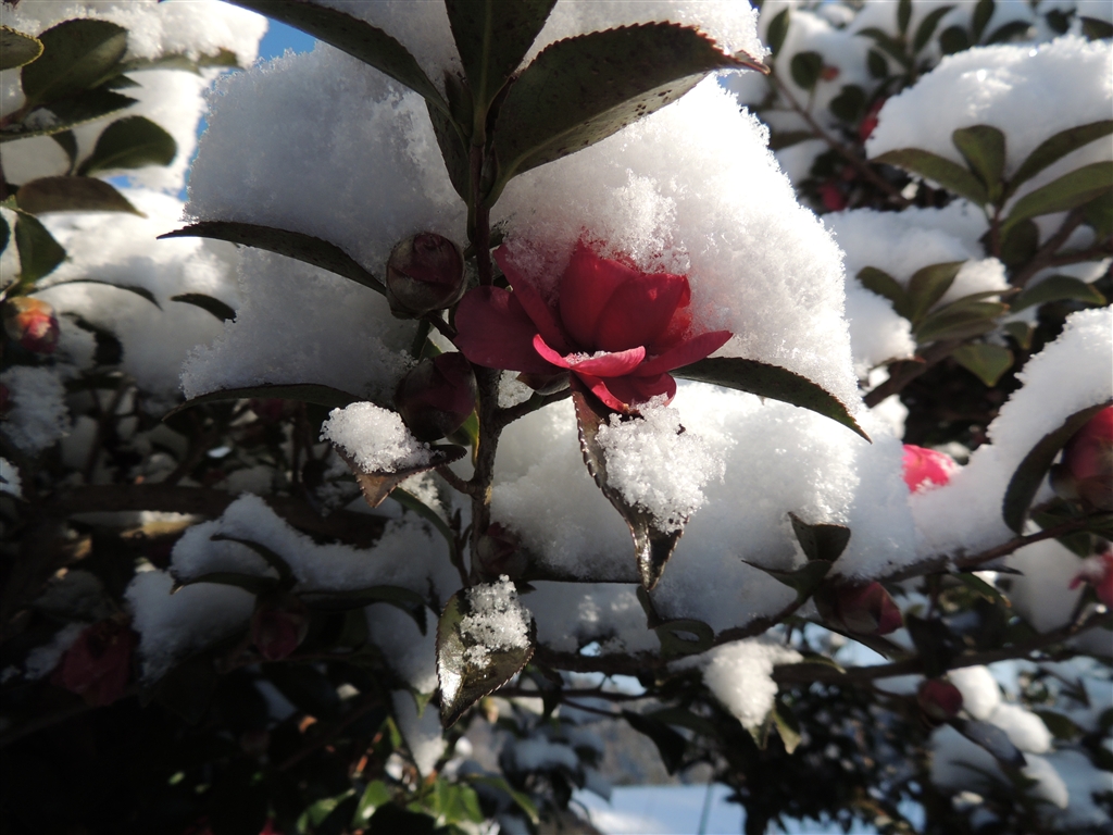 雪の帽子をかぶった寒椿。