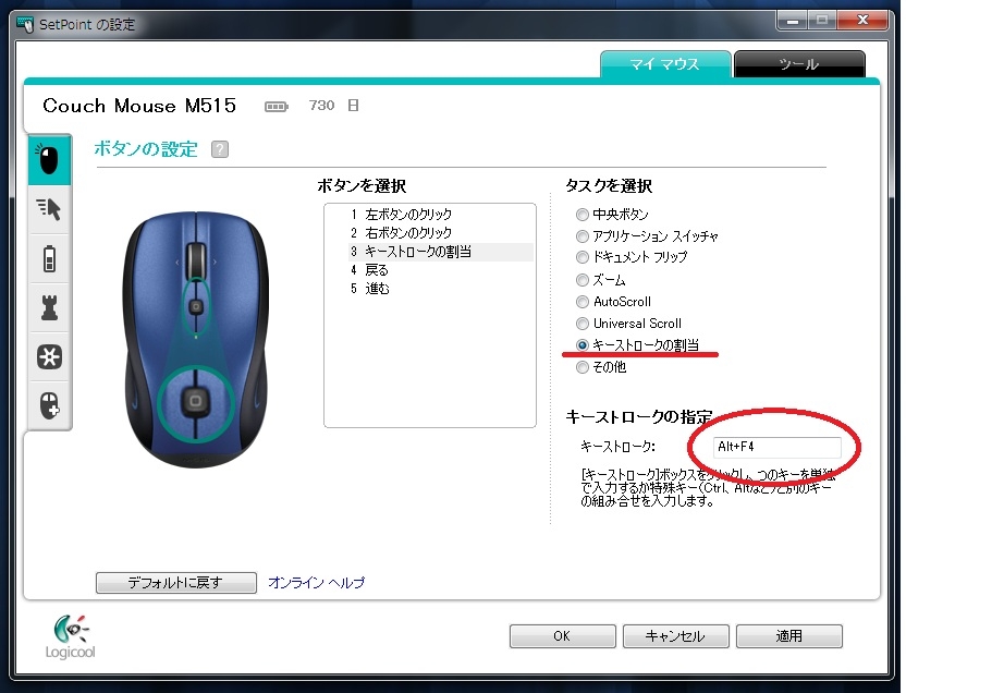 『赤い枠内「キーストローク:」にAlt+F4を指定』ロジクール Couch Mouse M515 ひとりぼっち…さんのクチコミ掲示板画像1/1