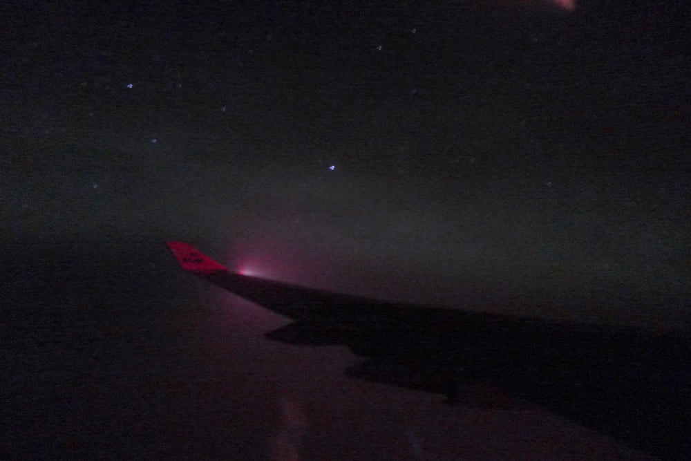 帰りの北極圏で機内からのオーロラ撮影