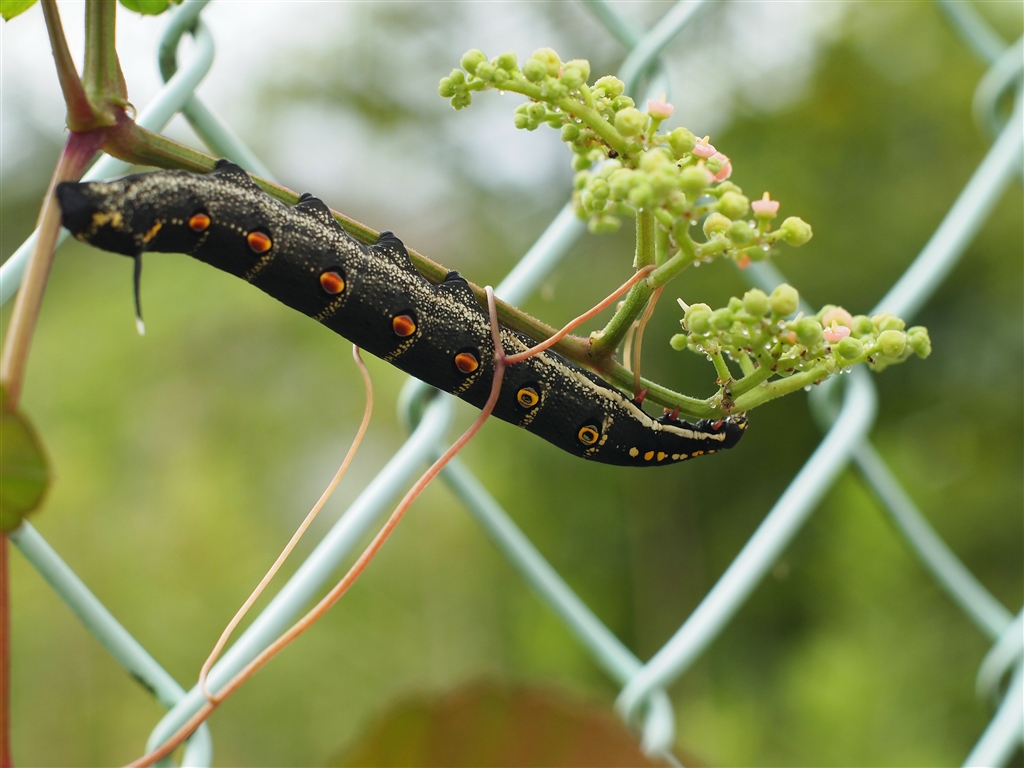 食草となるヤブガラシについているセスジスズメ幼虫