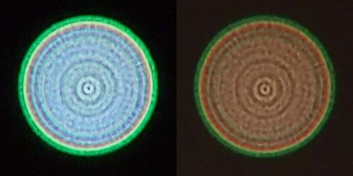 ピンホールで蛍光灯(左)と白熱灯(右)