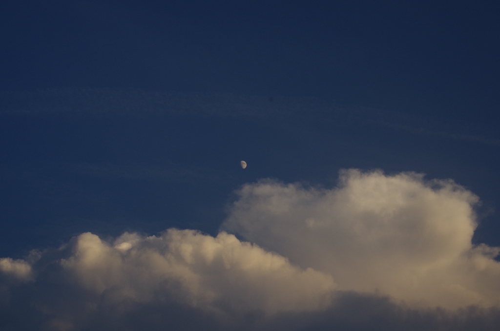 夏の夕刻の雲と月