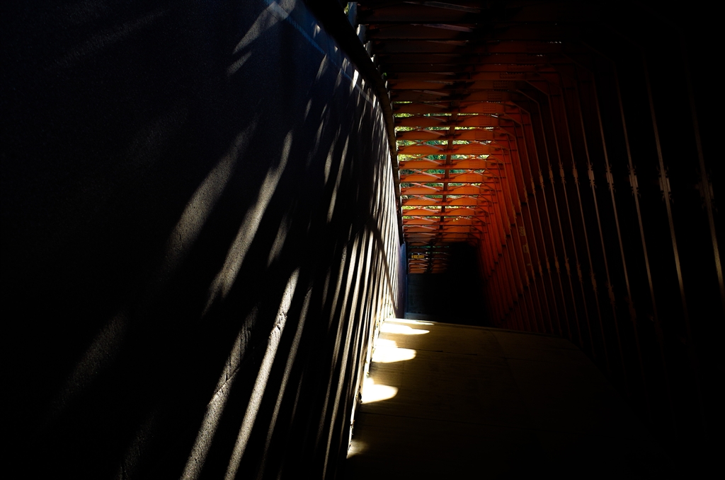 スノーシェッドをバイクが飛んでゆく