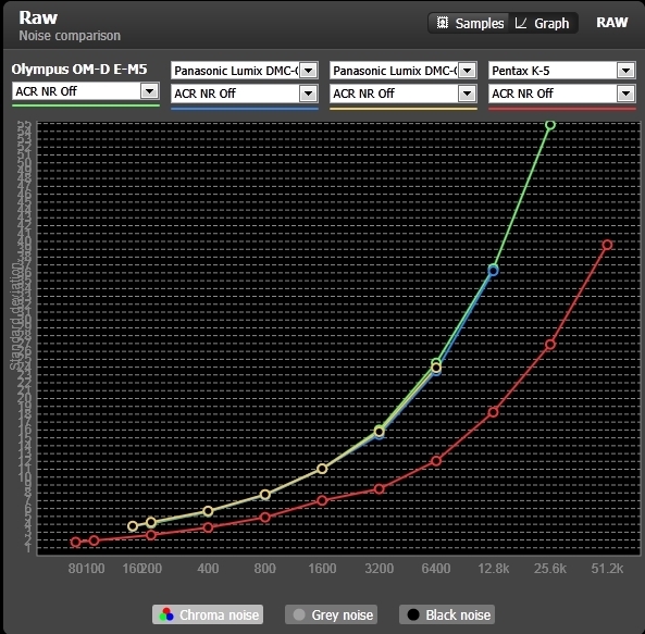 RAWノイズ比較(左からE-M5、E-5、E-P3、K-5)