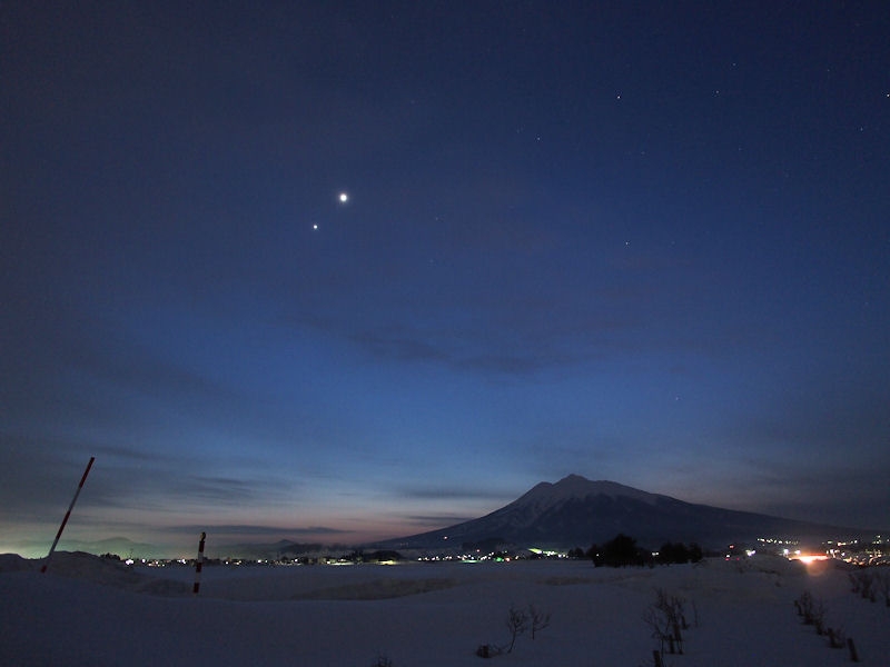 E-P3 + M.ZD ED 12mm F2.0 で撮影した金星・木星の接近と岩木山