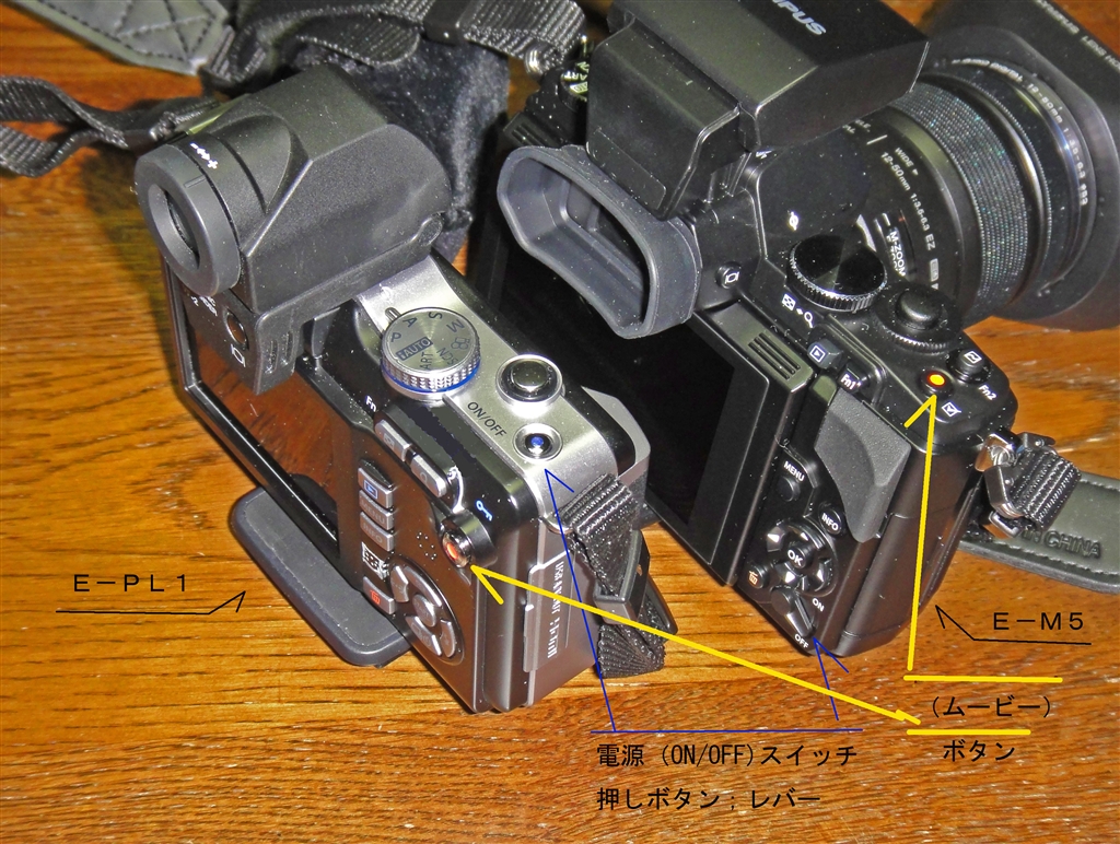 E-PL1とE-M5の 1)ムービーボタン 2)電源スイッチ_移動