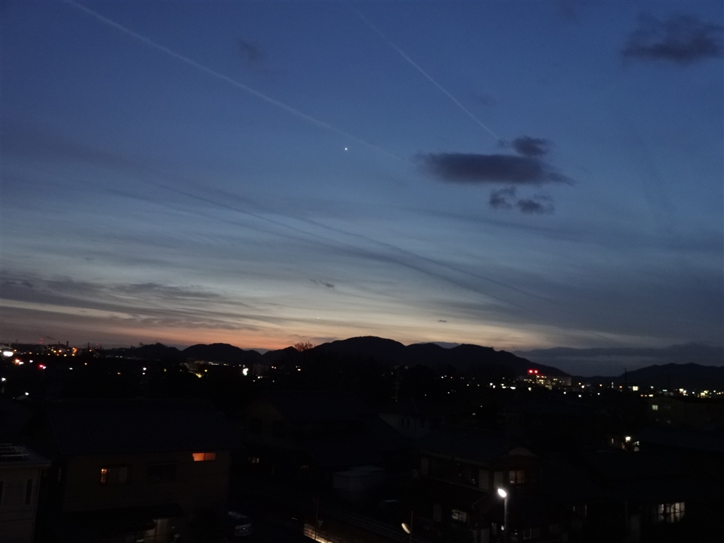 暮れなずむ街と飛行機雲