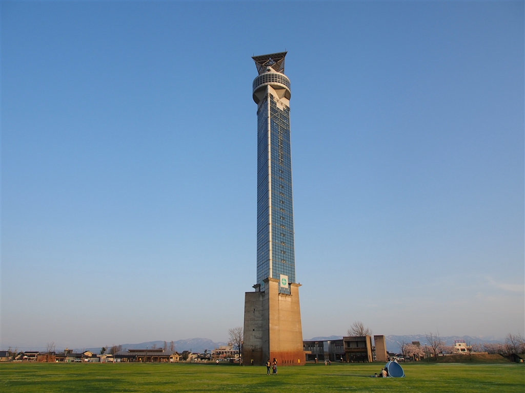 広場の片隅に屹立するクロスランドタワー