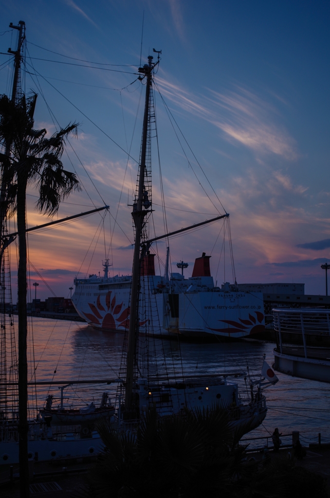 夕闇に憩う帆船とサンフラワー。