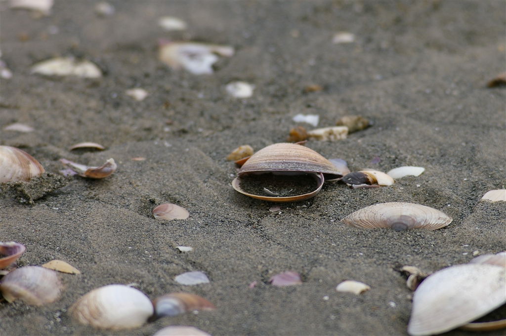 早春の砂浜で撮影した貝殻、晩御飯にしたかった