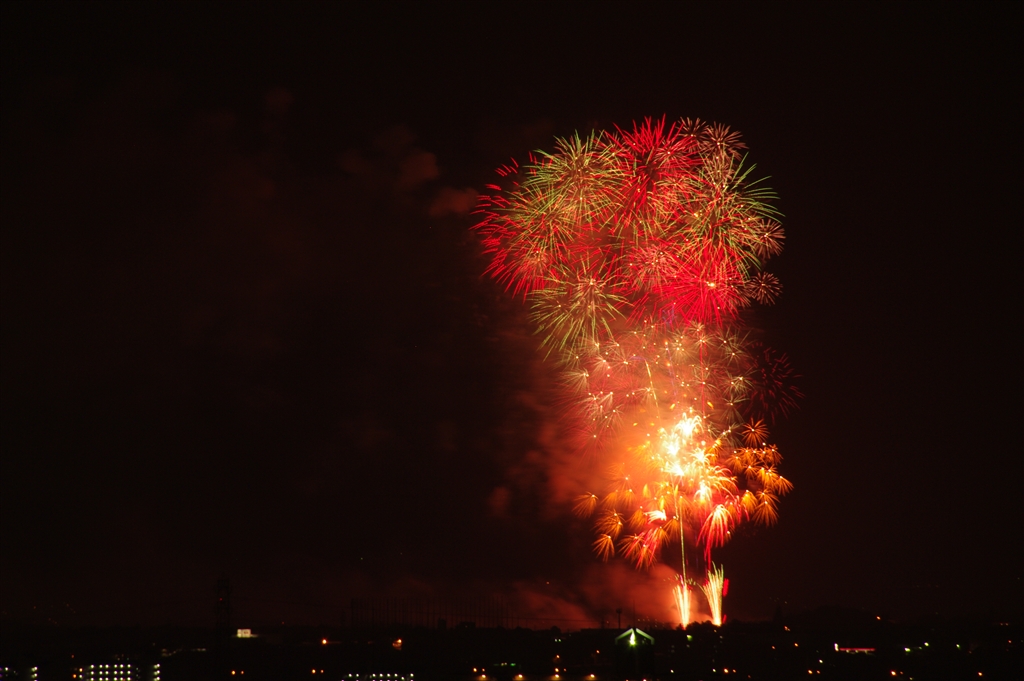 ちょっと古いですが9.4km先のPL花火 ベランダからK7+250mmで