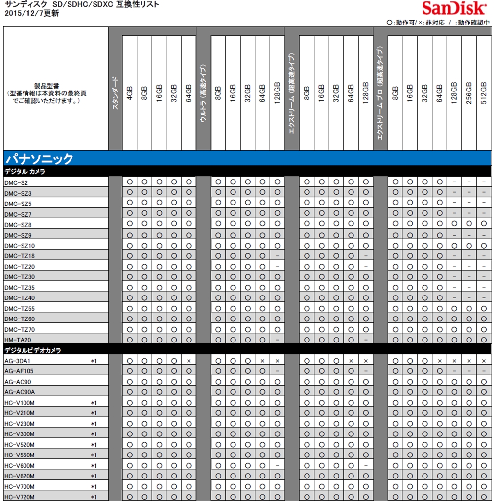 SanDisk パナソニック SD/SDHC/SDXC 互換性リスト 2015/12/7更新