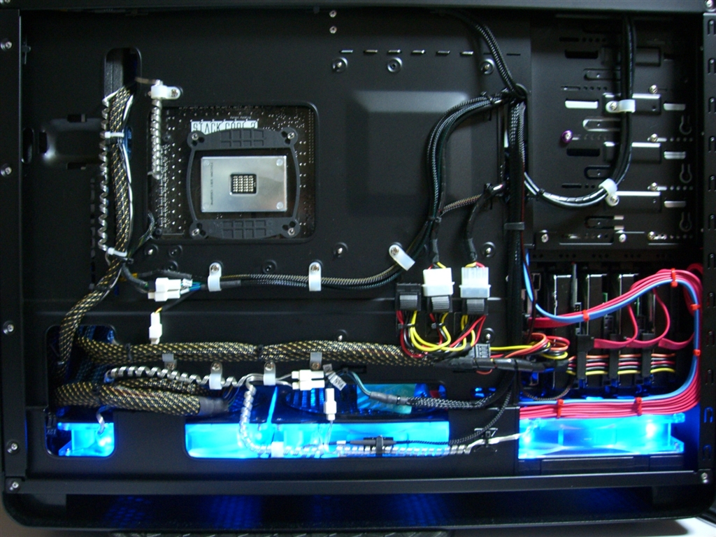 一番苦労した配線の取り回し。ファンのケーブルは丸い棒でクルクル