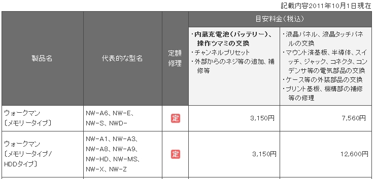 『電池交換他の料金表』SONY NW-A865 [16GB] 1985bkoさんのクチコミ掲示板画像1/1