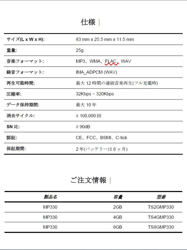 こちらはMP330無印。Flacの表記がありますがP/W/Kでは省かれたようです。