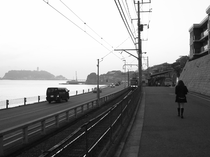 夕暮れの江の島と江ノ電風景