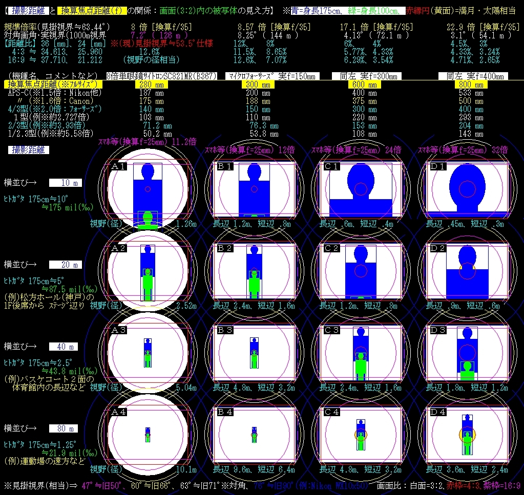 マイクロフォーサーズ実f=150mm【B】列 、実f=300mm⇒【C】列、撮影距離10m~80m