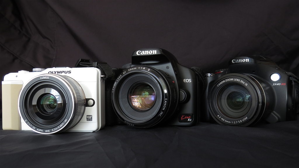 全てを満たそうとするとカメラが増えます。左からE-PL1s, Kiss X2, SX40HS...