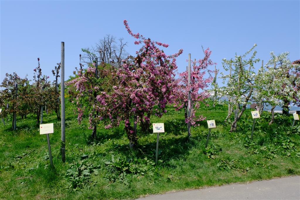 ほとんどのリンゴは白っぽい花ですが、この「ホバ」という品種は赤い花をつけます。