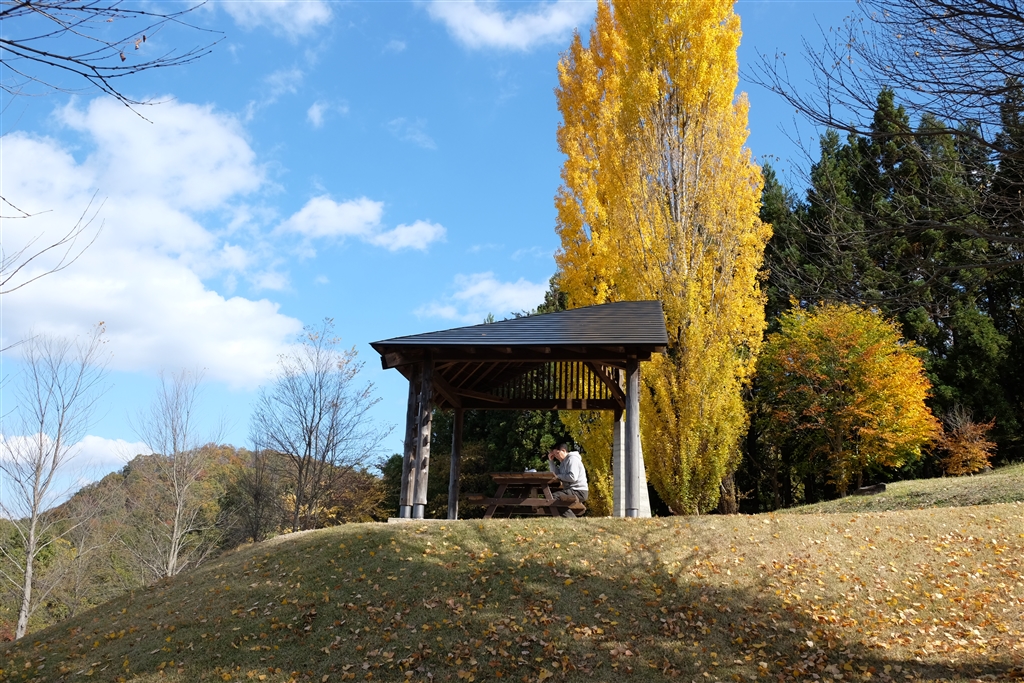 紅葉?したポプラの下で勉強中