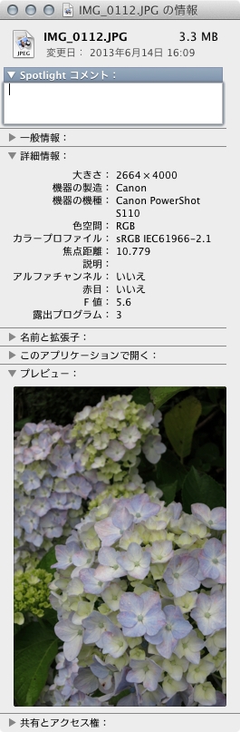 『iPhotoで取り込んだjpgのオリジナルをFinderで見た状態』CANON PowerShot S110 タム☆タムさんのクチコミ掲示板画像1/1