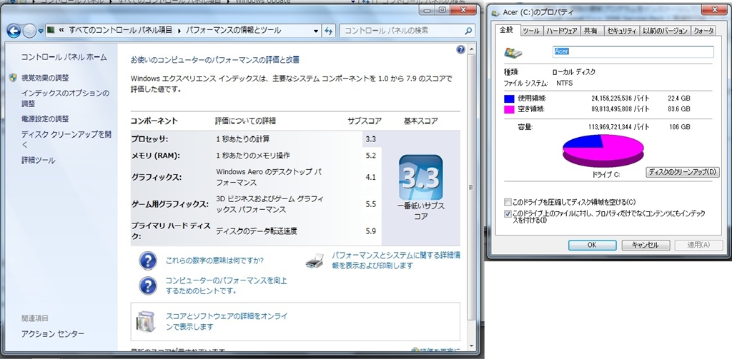 『ディスク容量とエクスペリエンス結果』Acer Aspire One 722 AMD Dual-Core C60搭載モデル aoao47さんのクチコミ掲示板画像1/2