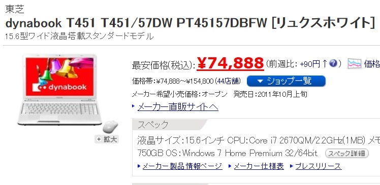 東芝 dynabook Qosmio T751 T751/T8C 2011年夏モデル 光100さんのクチコミ掲示板画像1/1