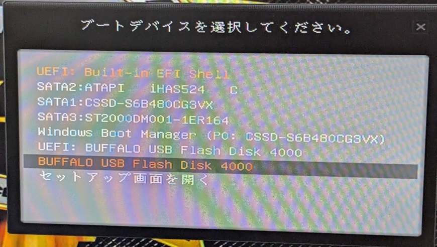 Bブートデバイス選択メニュー画面の例