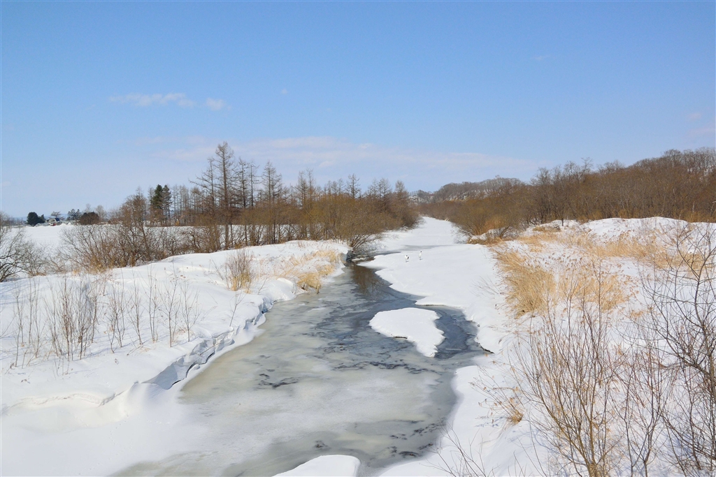 雪解けの川に戻って来た丹頂くん1