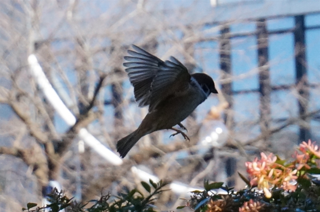 日陰の飛翔スズメ(日向であればちゃんと写ったかもT_T )(トリミングあり)