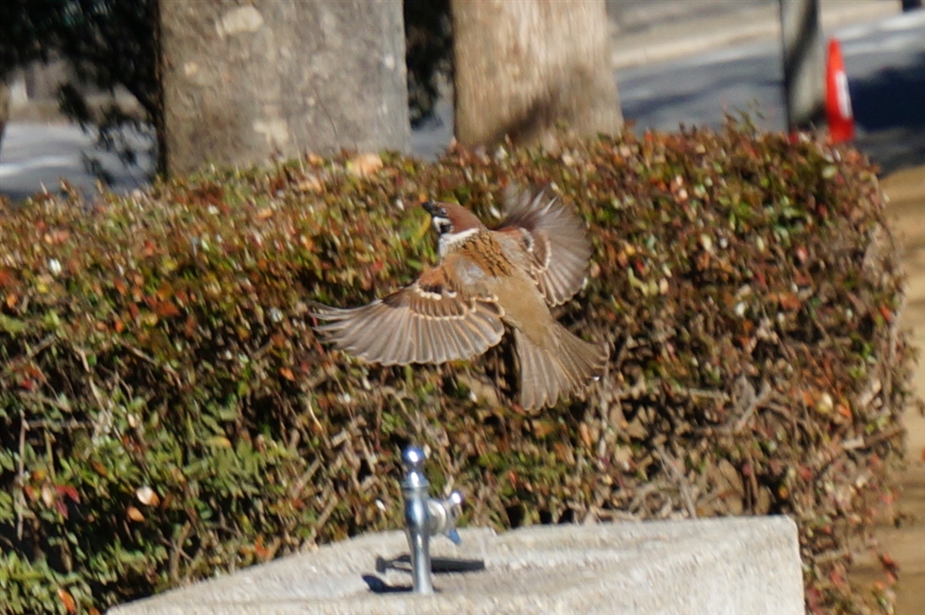 水飲み場の上の飛翔スズメ