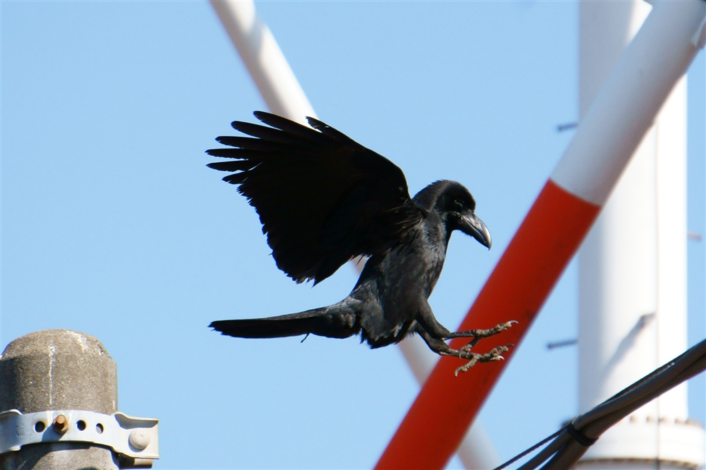 カラス飛翔(電柱から電線へジャンプした瞬間) トリミングあり