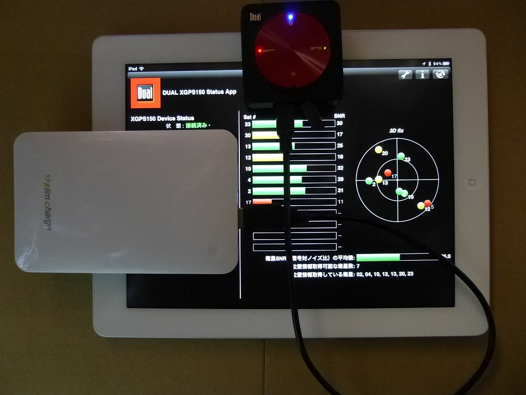 XGPS150Aにバッテリーを接続(下はiPad)